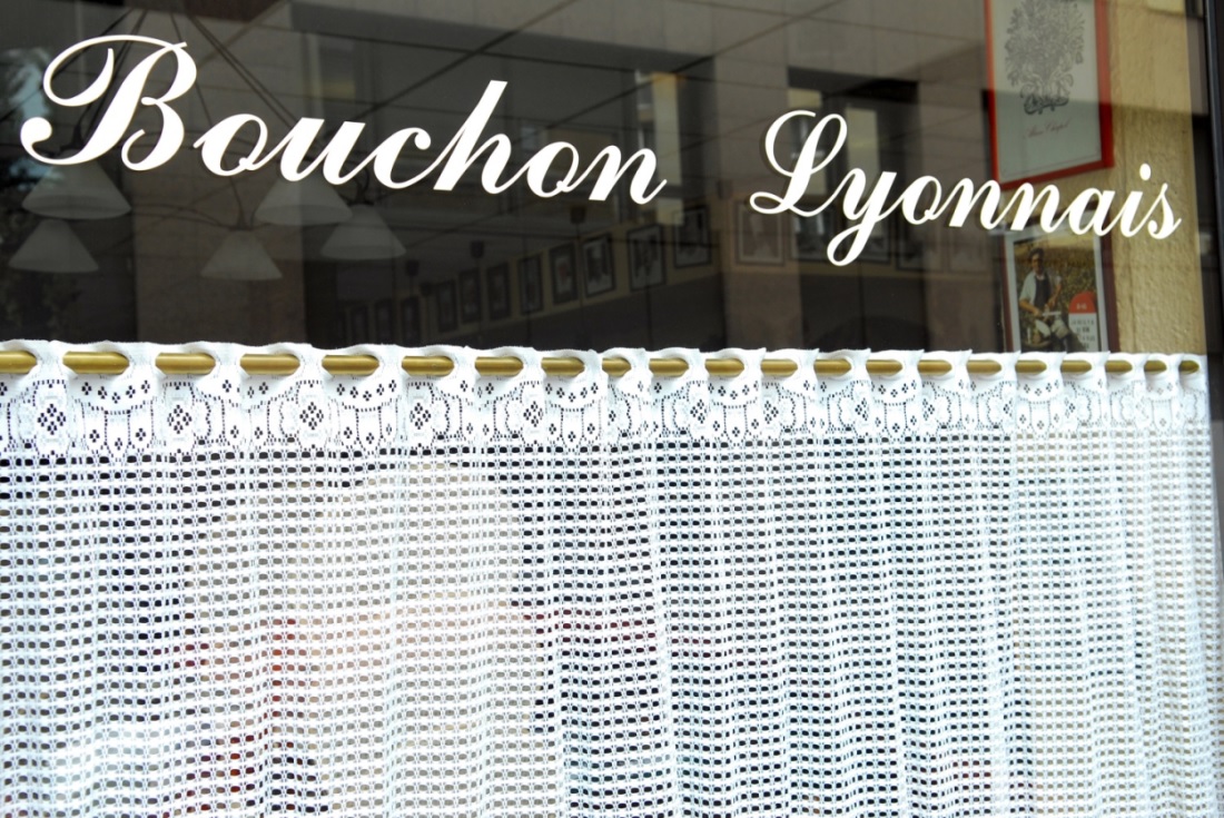 O exterior de um restaurante com o texto Bouchon Lyonnais na janela.