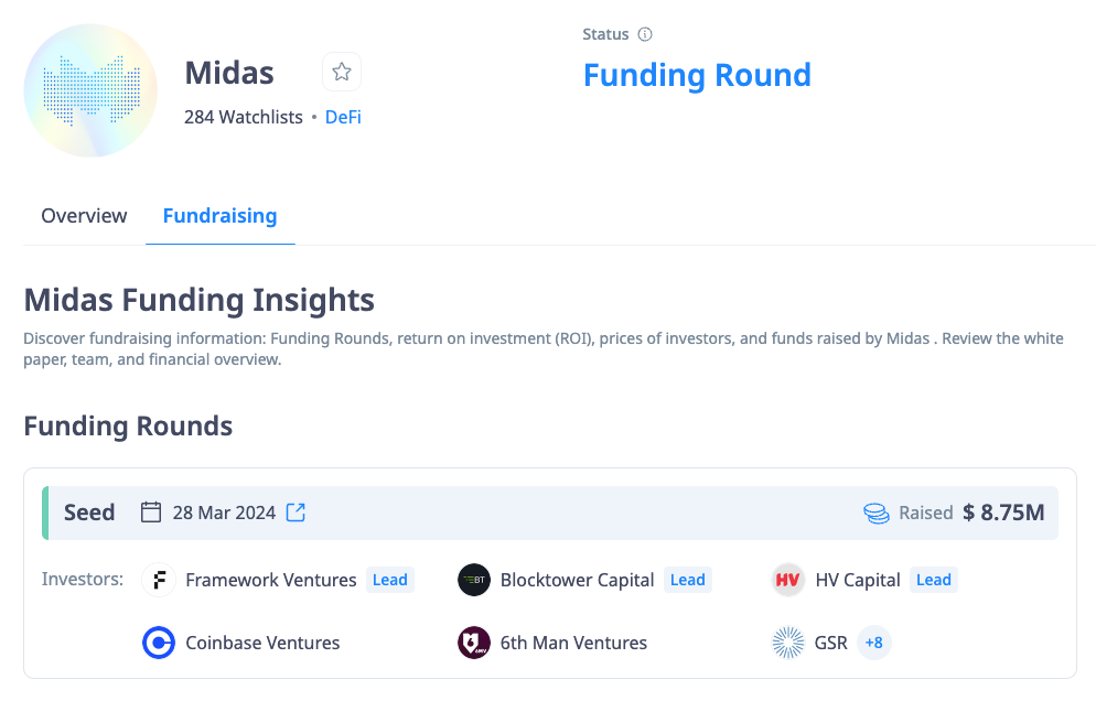 - Funding: Midas closed seed/early rounds around $8.5–8.75 million, reported on Bitget, CryptoRank, and on the project’s X (Twitter) channels. The protocol funding rounds are backed by Backed by Hi Framework, Strobe Ventures, GSR, and Coinbase Ventures.