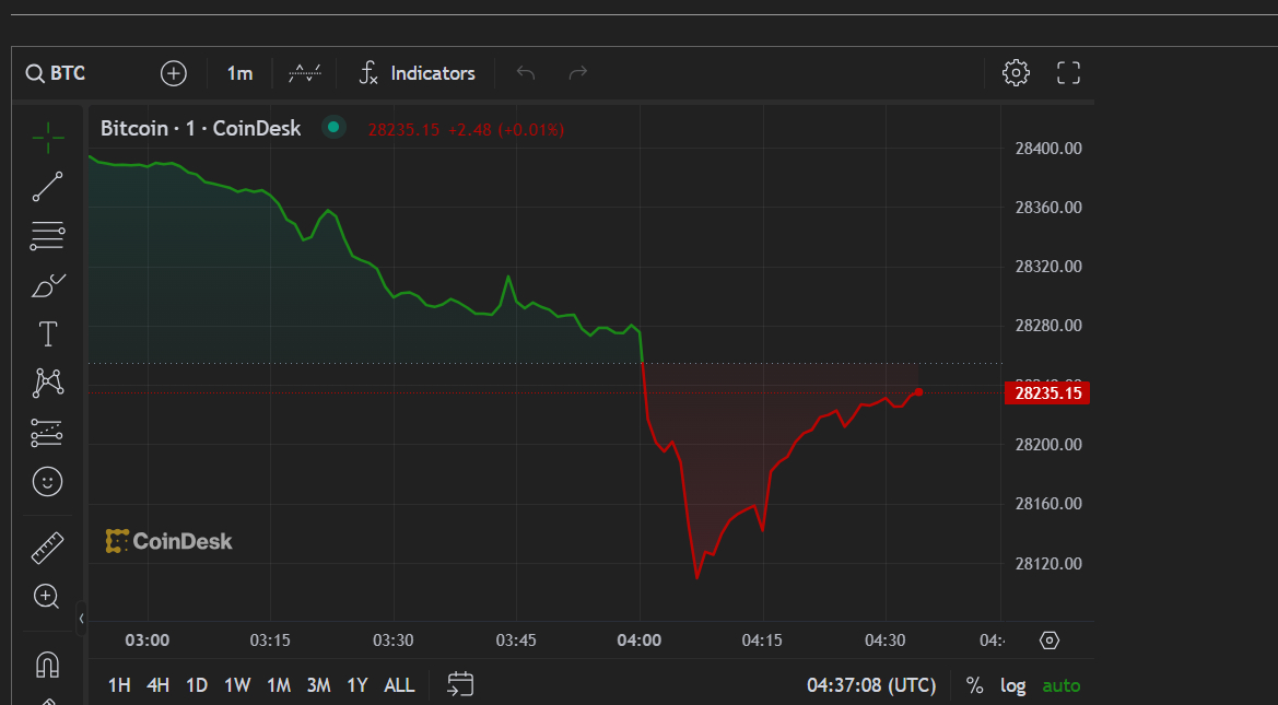 Após esse movimento ascendente, o bitcoin recuou, sendo negociado abaixo de US$ 28.300 no momento deste relatório, revelam números adicionais da CoinDesk.