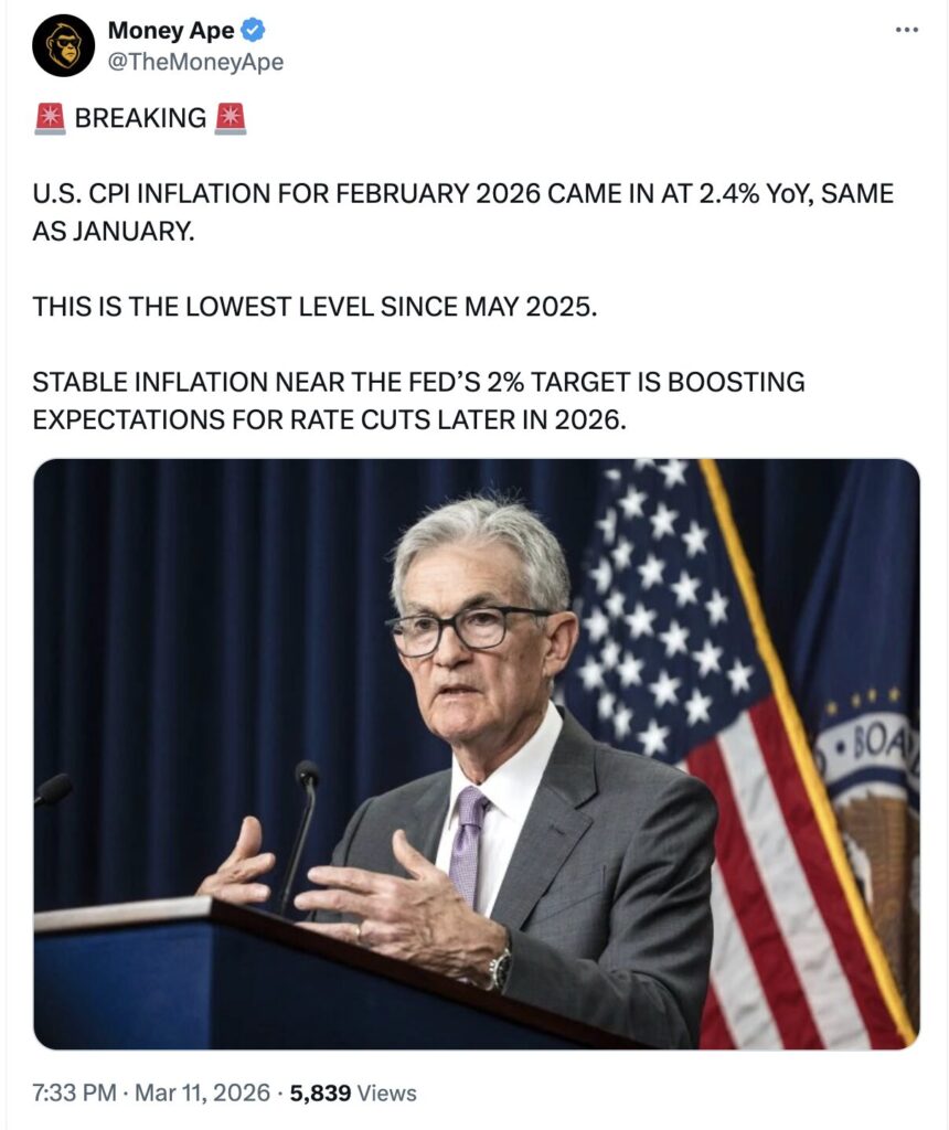 Os últimos dados de inflação dos EUA divulgados em 8h30 horário do leste dos EUA está chamando a atenção nos mercados financeiros, especialmente entre os investidores em criptomoedas. O Índice de Preços ao Consumidor (IPC) rosa 0,3% em fevereirotrazendo o taxa de inflação anual para 2,4%de acordo com o Bureau of Labor Statistics dos EUA. Ambos os números corresponderam às expectativas dos economistas, sugerindo que as pressões inflacionistas estão a estabilizar, mas ainda permanecem acima dos valores da Reserva Federal. Meta de 2%.