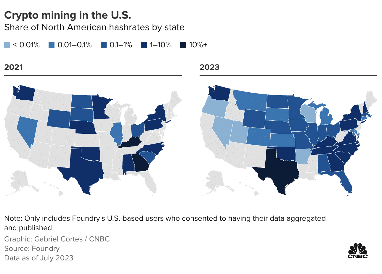 Programas como o LFLTF da ERCOT incentivaram mais mineradores de criptomoedas a estabelecer operações no Texas. De acordo com dados da Foundry USA – um provedor de serviços de mineração de criptografia – o Texas representou 8,43 por cento do Hashrate de mineração de Bitcoin nos EUA no final de 2021, e essa percentagem saltou para 28,50% em 27 de julho de 2023.