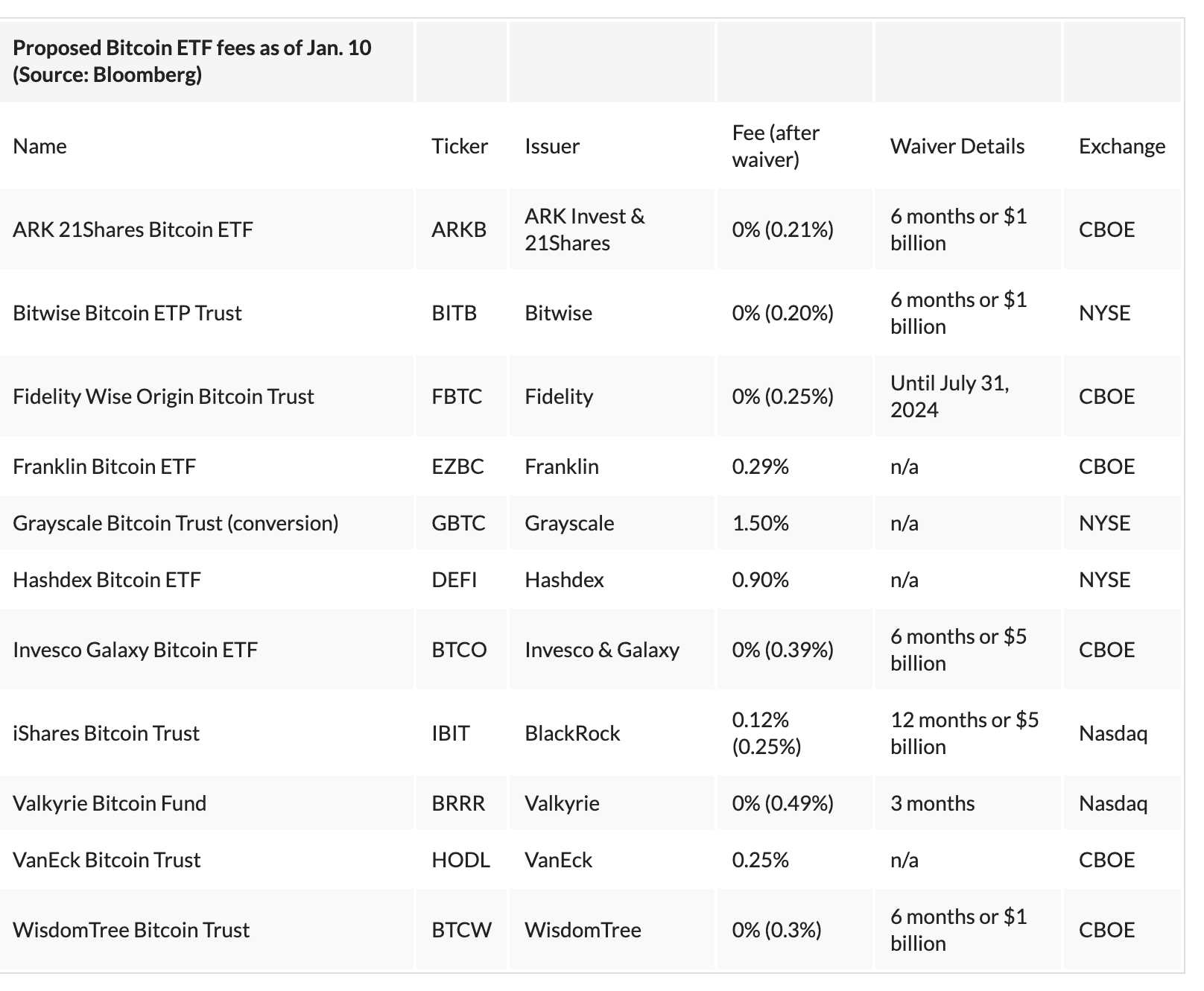 Embora se espere que os fundos spot do ETF tragam bilhões de dólares de capital novo para o Bitcoin, é importante observar que as taxas estão associadas. Em um esforço para atrair investidores, muitas das empresas que oferecem ETFs à vista anunciaram baixas taxas de administração iniciais com o ETF iShares da BlackRock. carregando 0,12% nos primeiros 12 meses (ou primeiros US$ 5 bilhões em entradas) e o ETF Invesco Galaxy renunciando totalmente à sua taxa durante os primeiros seis meses (ou US$ 5 bilhões).
