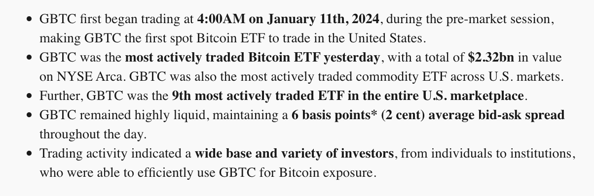 Curiosamente, foi relatado que The Grayscale Bitcoin Trust (GBTC) liderou o volume de negociações em 11 de janeiro, mesmo com a taxa de negociação mais alta. De acordo com o boletim informativo The Grayscale Team de 12 de janeiro, o GBTC foi o ETF Bitcoin mais negociado em 11 de janeiro, com um valor total de US$ 2,32 bilhões em NYSE Arca. A postagem também observou que o CBTC era o ETF de commodities mais negociado nos mercados dos EUA.
