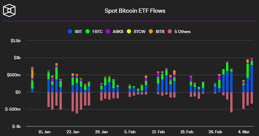 O IBIT da BlackRock, o FBTC da Fidelity, o ARKB da Ark/21 Shares e os outros ETFs recém-lançados registraram entradas de quase US$ 1 bilhão por dia na terça e quarta-feira, conforme dados apresentados pela O bloco.