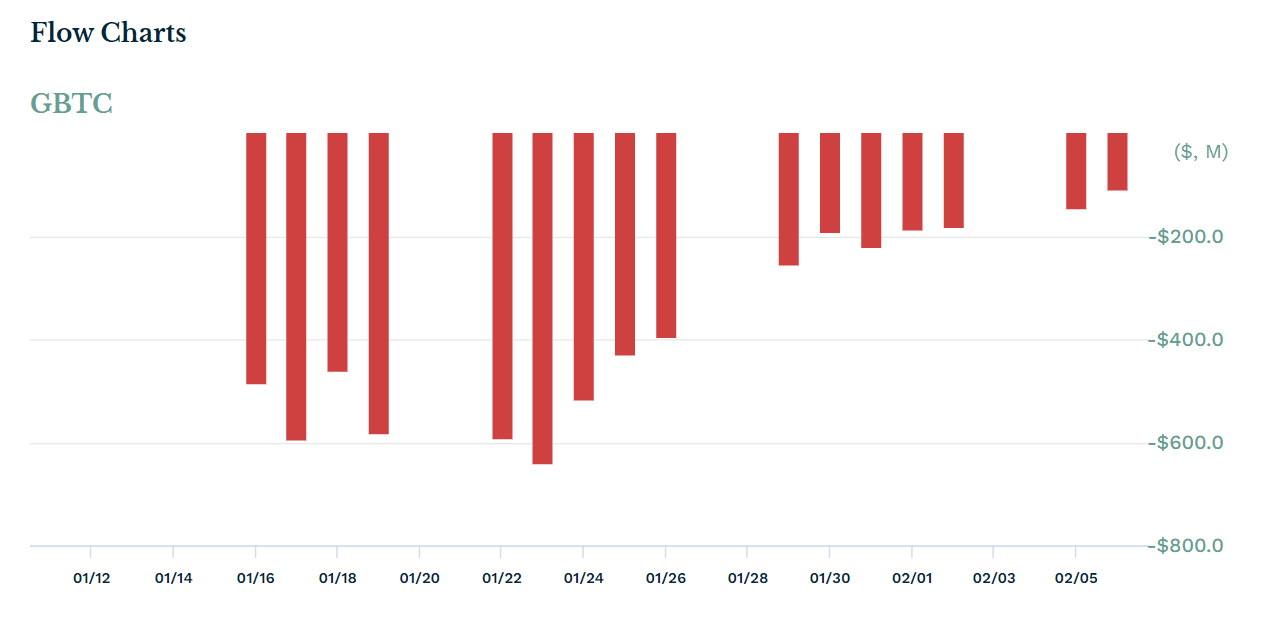 Conforme Dados ETF.comas saídas do Bitcoin Trust (GBTC) da Grayscale continuam com tendência de queda.