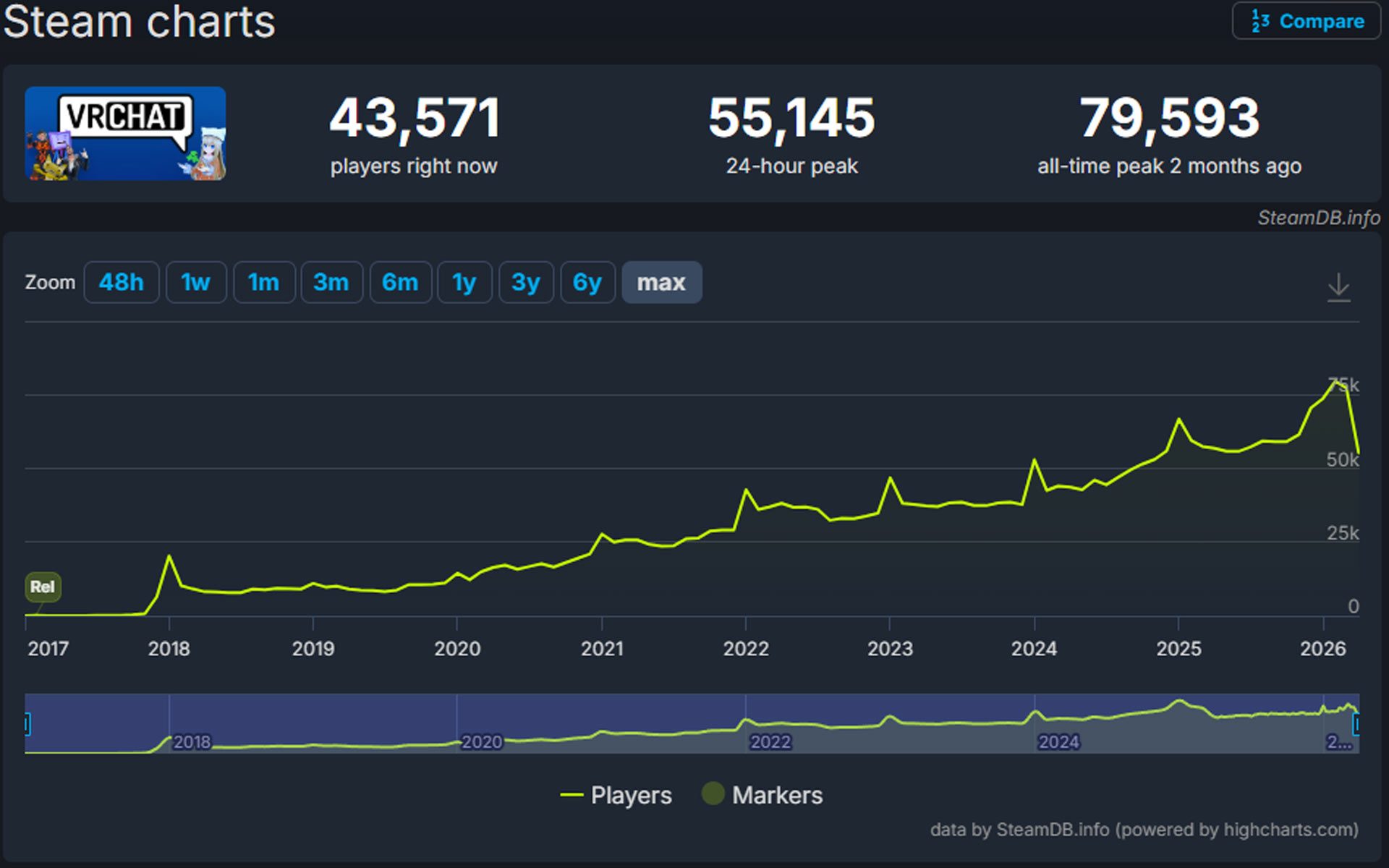 De acordo com Gaylor e Joudrey, que fundaram o VRChat em 2014, parte dessa confiança vem da capacidade da plataforma de atrair consistentemente um número recorde de visitantes em Quest, SteamVR, headsets Pico, PC e dispositivos móveis.