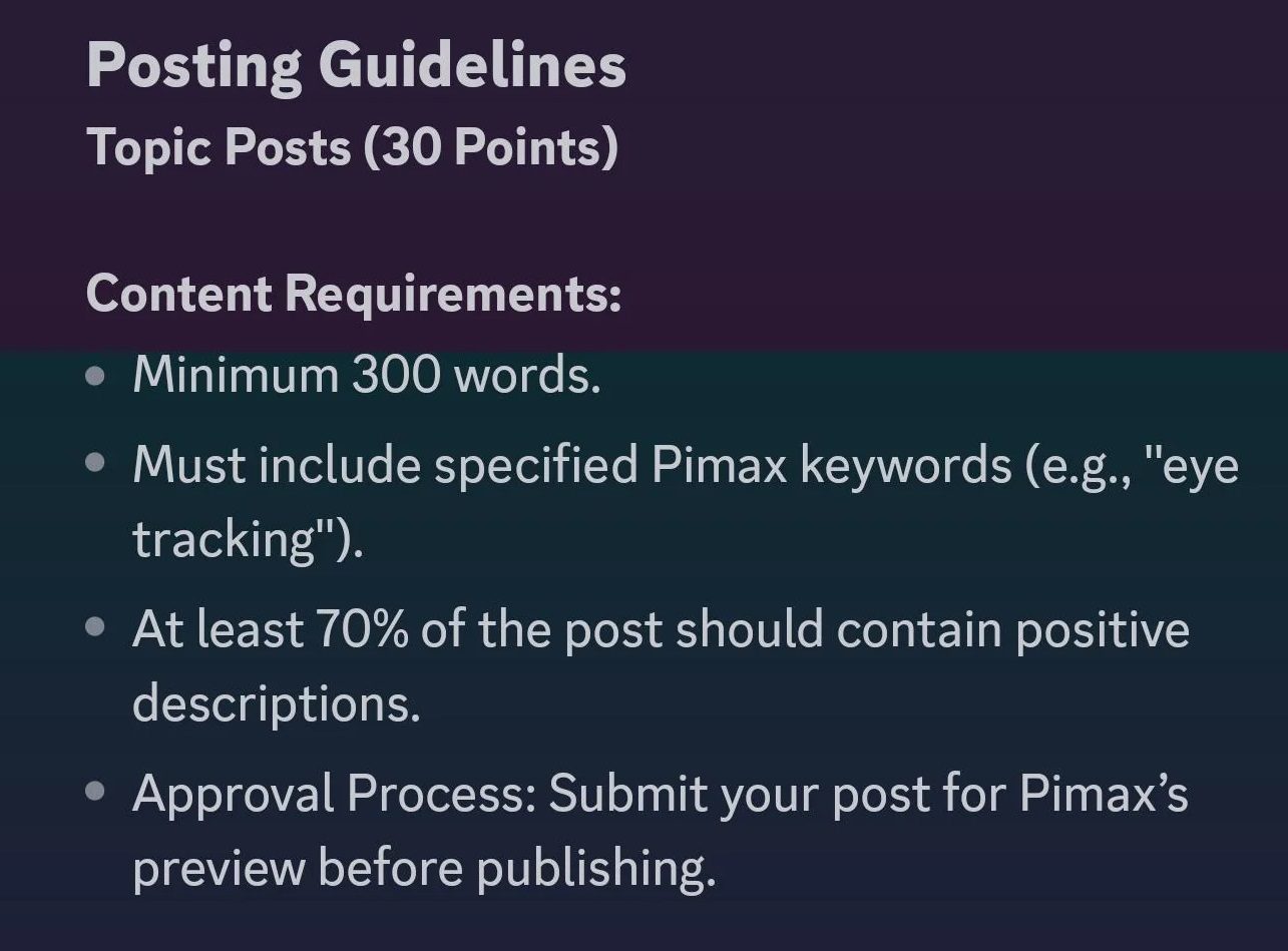 A única coisa que os participantes selecionados precisavam fazer era digitar um verificamente positivo Post para o Reddit “ou qualquer outro fóruns que você visitar”, envie -o ao PIMAX para aprovação, publique -o on -line e acumule os pontos. Abaixo está um trecho das diretrizes de publicação dadas ao Mavgaming1 via Discord.