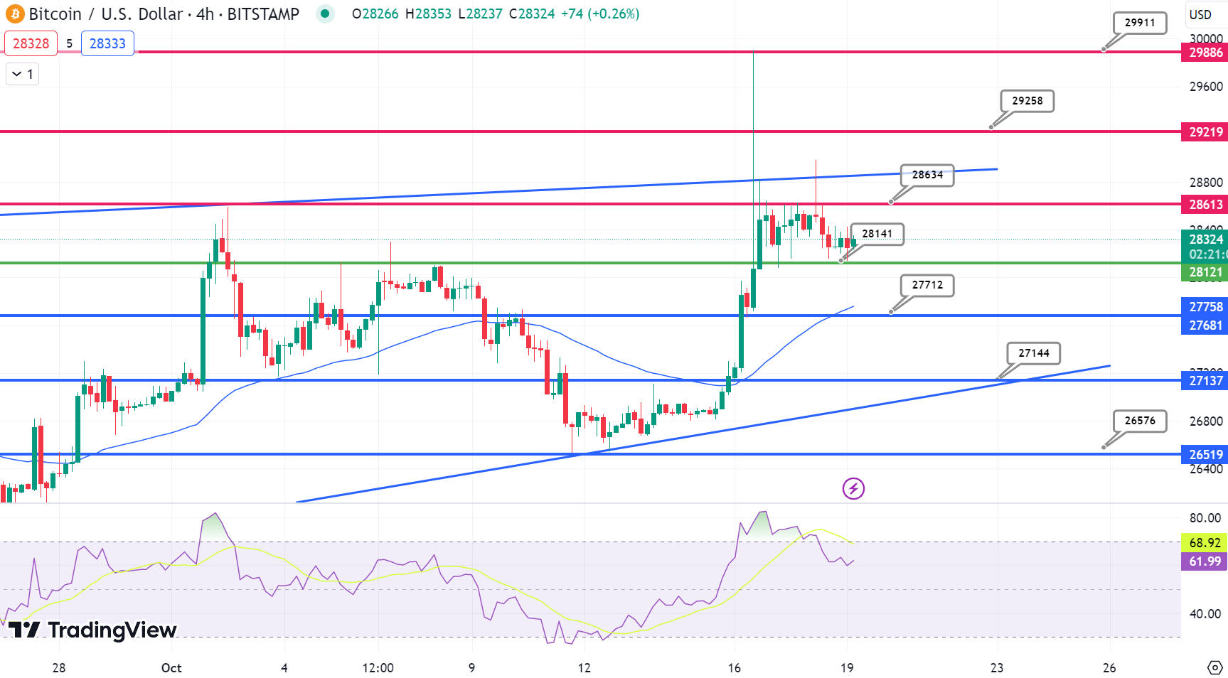 Para a análise técnica BTC/USD de 18 de outubro, a atividade do Bitcoin é evidente em um gráfico de 4 horas. O valor principal do ativo é de $ 28.582. Atualmente, ele encontra resistência sequencial em US$ 29.237, seguido por US$ 29.921 e depois em US$ 30.500.