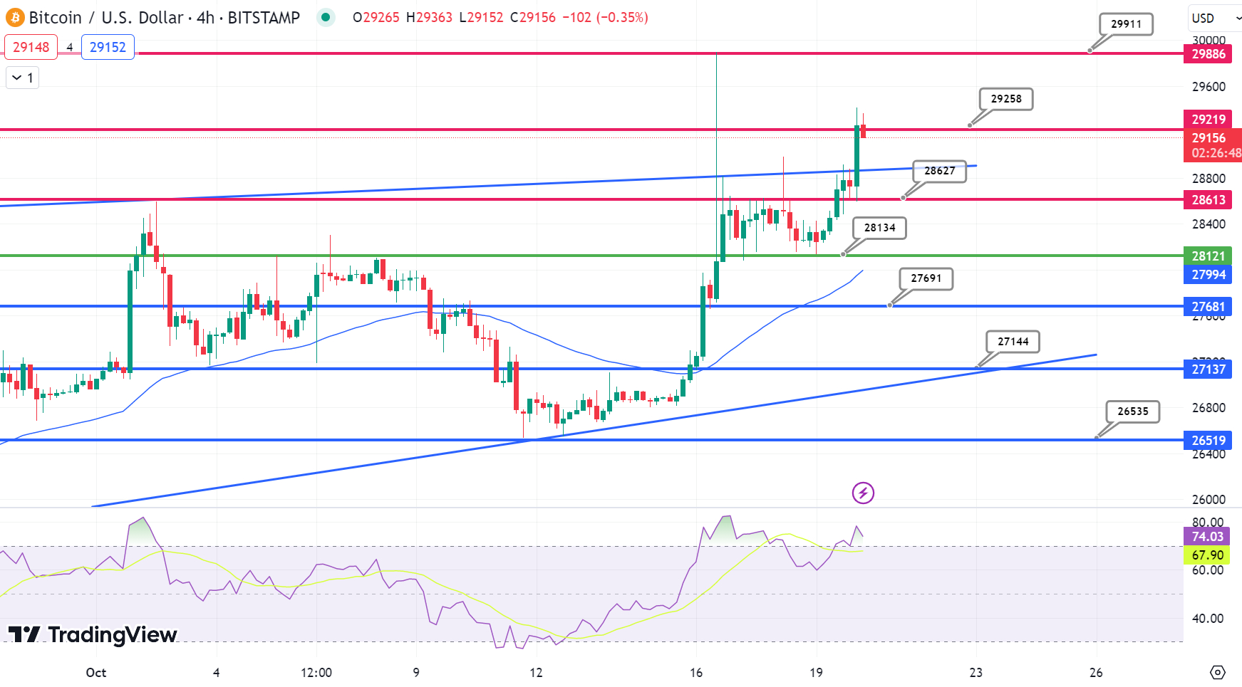 A tendência geral sugere uma tendência de baixa abaixo da marca de US$ 29.250, mas isso pode se tornar altista se os preços subirem acima.
