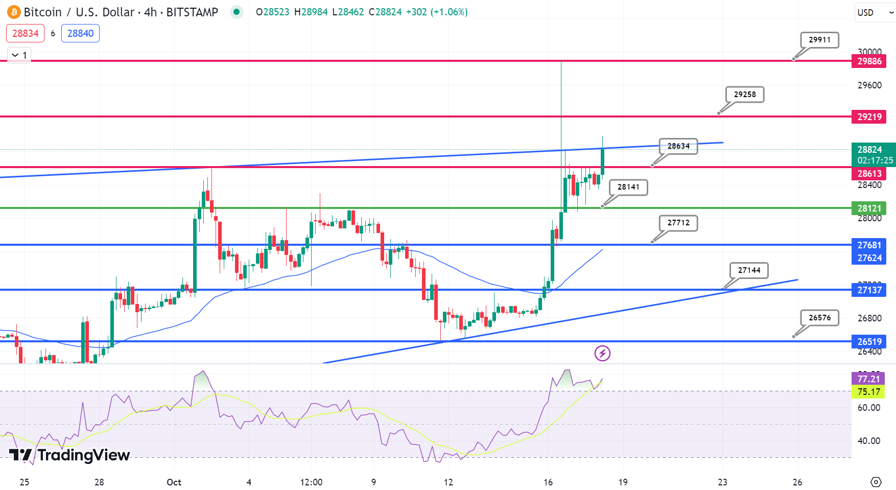 Concluindo, a tendência geral do BTC/USD parece de alta, especialmente se o preço permanecer acima da marca de US$ 28.600.