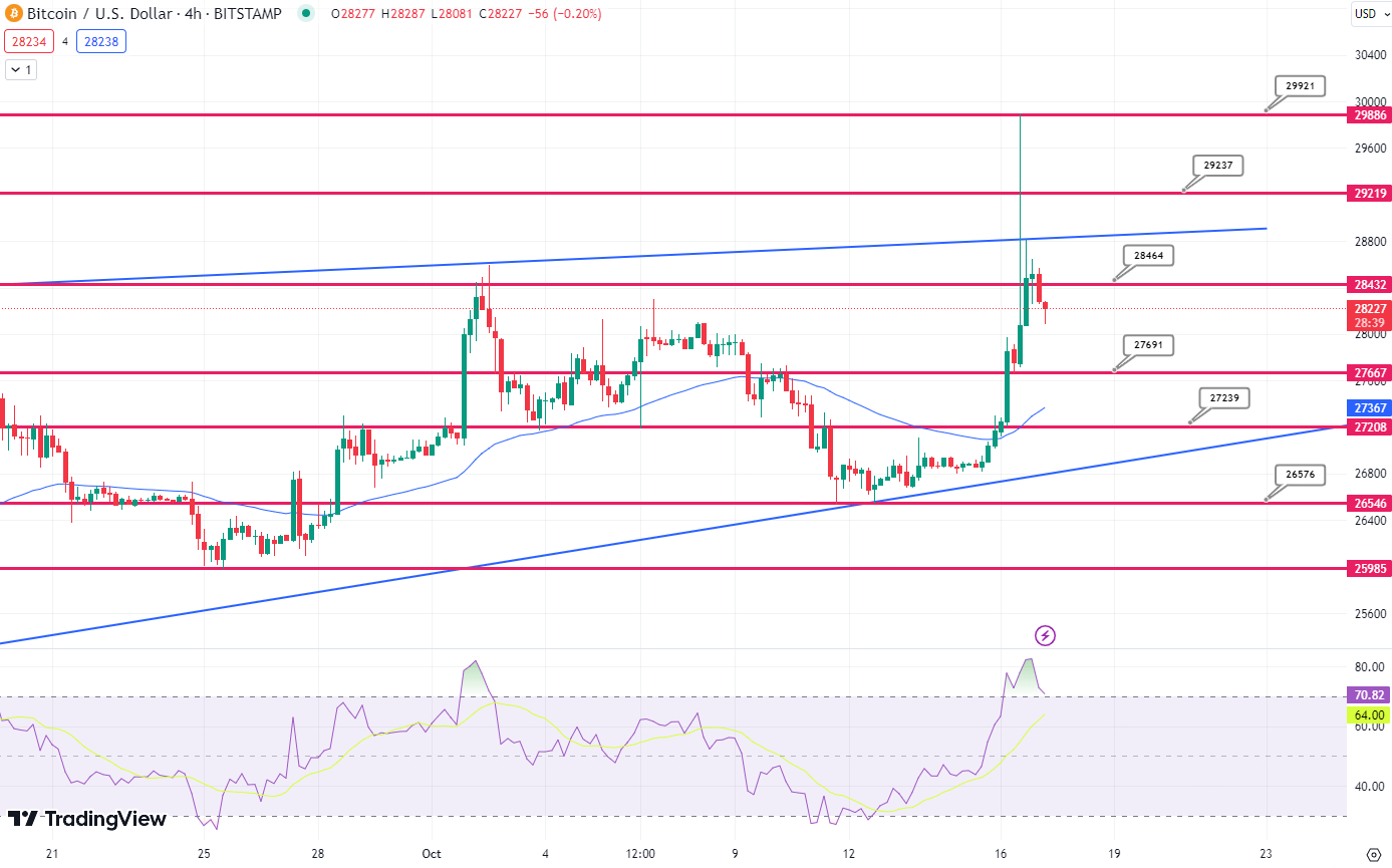 Na perspectiva técnica BTC/USD para 17 de outubro, o Bitcoin é negociado em um período de 4 horas. O ponto de articulação do ativo é de US$ 28.582. Atualmente enfrenta resistência imediata, seguinte e adicional em US$ 29.237, US$ 29.921 e US$ 30.500, respectivamente.