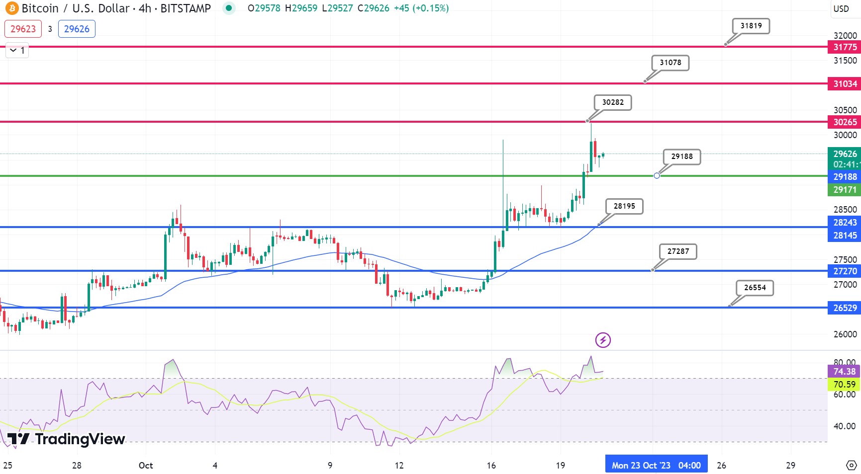 O actual preço do Bitcoin hoje é notável $ 29.599, refletindo um aumento de 3% nas últimas 24 horas.