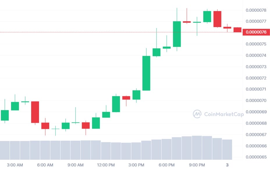 Pepe, com preço de US$ 0,000007616, tem uma capitalização de mercado significativamente maior, de aproximadamente US$ 3,2 bilhões, tornando-o uma das maiores entidades na categoria de moedas meme. Nas últimas 24 horas, o volume de negócios de Pepe atingiu cerca de US$ 1,23 bilhão. Apesar do seu pequeno aumento incremental, Pepe viu um aumento de quase 13% no valor nas últimas 24 horas.