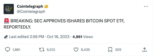 Essa rápida escalada foi atribuída a rumores não confirmados em plataformas de mídia social de que a SEC dos EUA havia dado luz verde ao aplicativo iShares spot Bitcoin ETF da BlackRock.