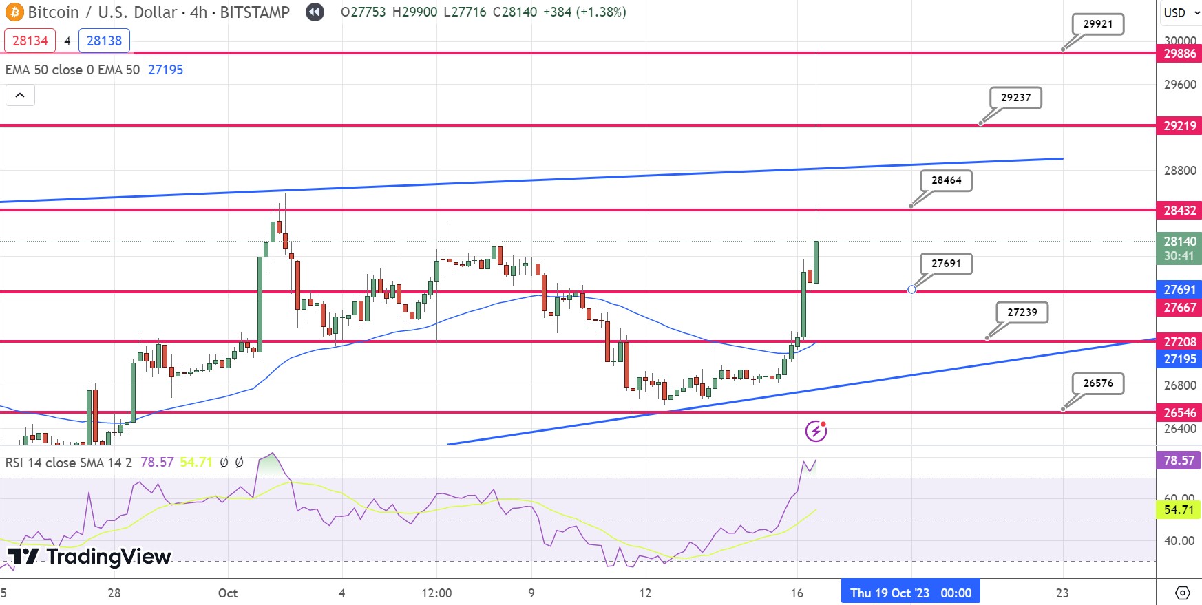 Em 16 de outubro, o Bitcoin (BTC) foi negociado por US$ 28.119, marcando um aumento impressionante de quase 4,5% nas últimas 24 horas. Este movimento ascendente é apoiado por um volume substancial de negociações de 24 horas de US$ 24,57 bilhões.