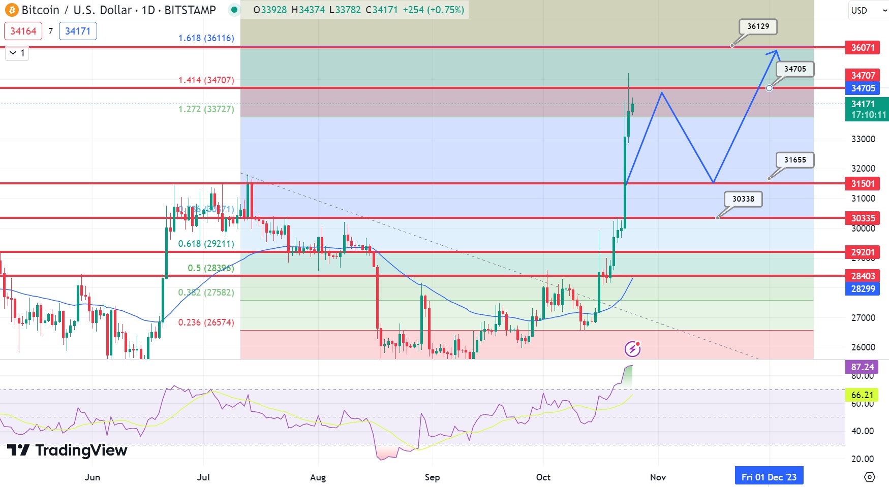 Bitcoino renomado ouro digital do mundo das criptomoedas, apresentou uma jogada intrigante em seus gráficos a partir de 25 de outubro. Atualmente cotado em US$ 34.122, o movimento de 24 horas do BTC revela uma ligeira queda de quase 0,75%.
