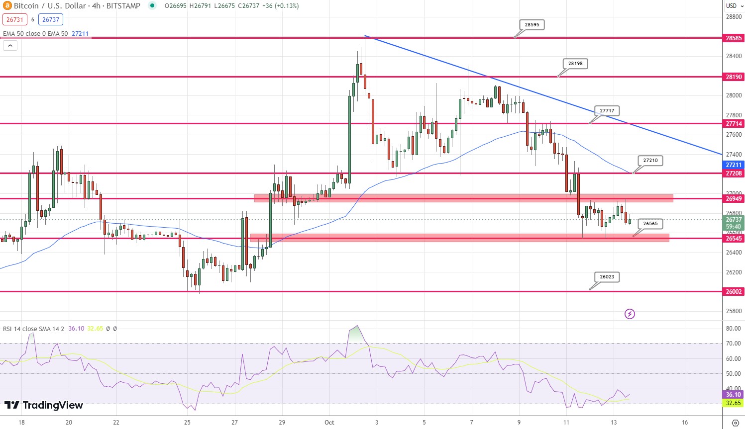 Em 13 de outubro, o preço atual de negociação do Bitcoin é de US$ 26.730, refletindo um ganho marginal de 0,10% nas últimas 24 horas.