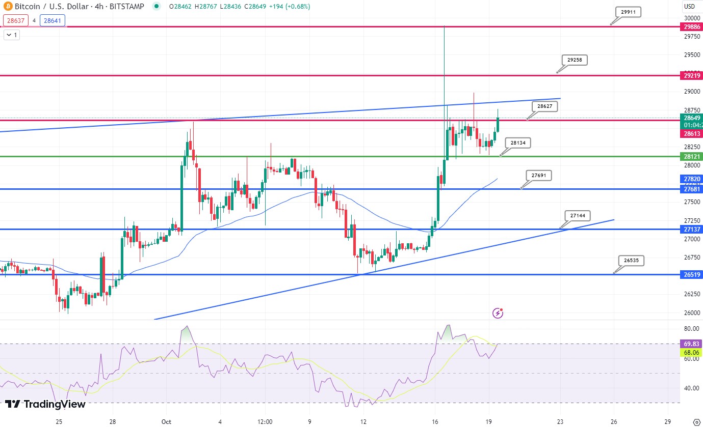 No cenário atual das criptomoedas, Preço do Bitcoin atraiu atenção significativa. Em 19 de outubro, o preço do Bitcoin era de US$ 28.541, tendo experimentado um aumento de quase 1% nas últimas 24 horas e de 7% nos últimos sete dias.
