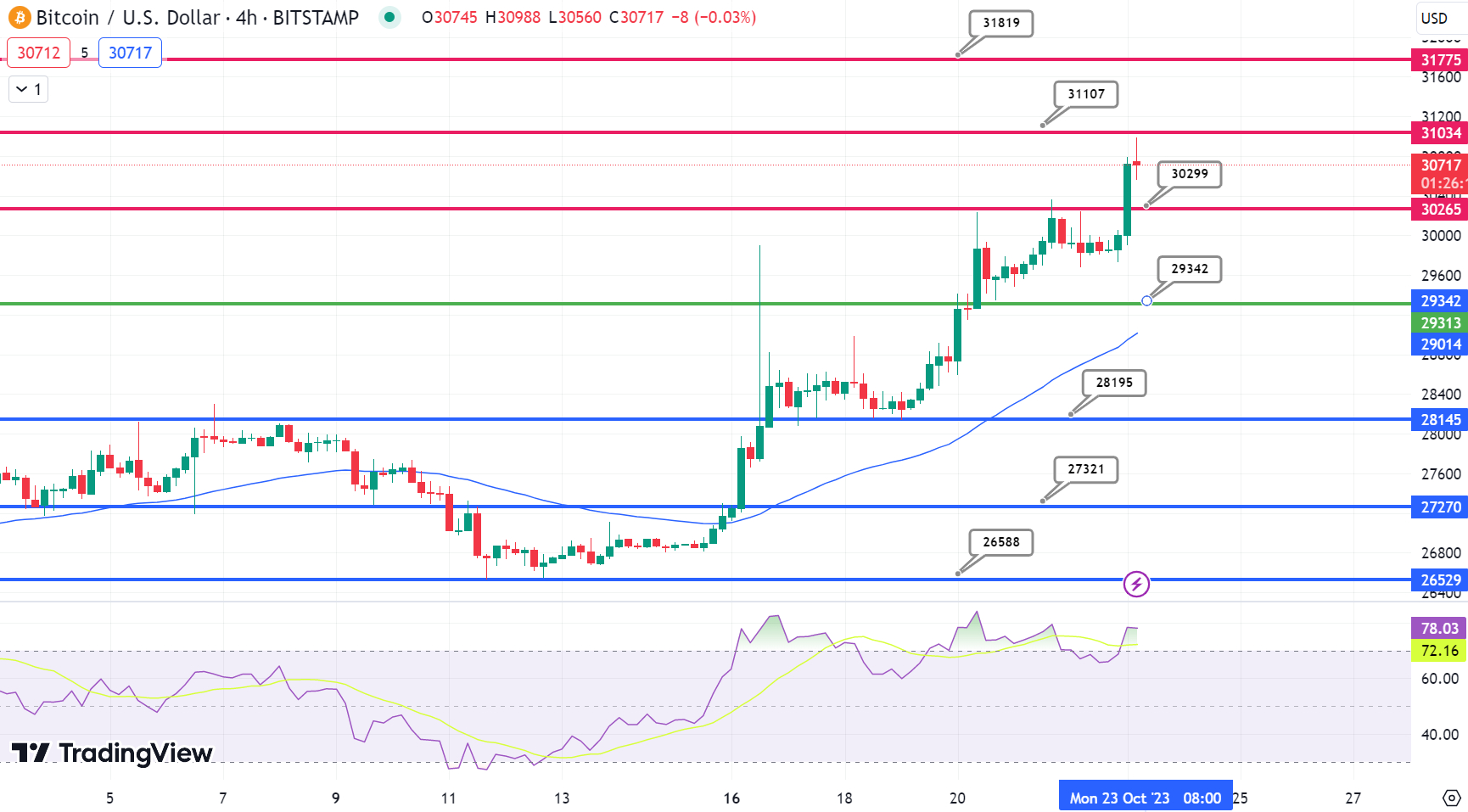 Ao analisar o gráfico de 4 horas do Bitcoin, surgem vários níveis de preços importantes. O ponto de articulação é US$ 29.208 e a resistência imediata é US$ 31.207.