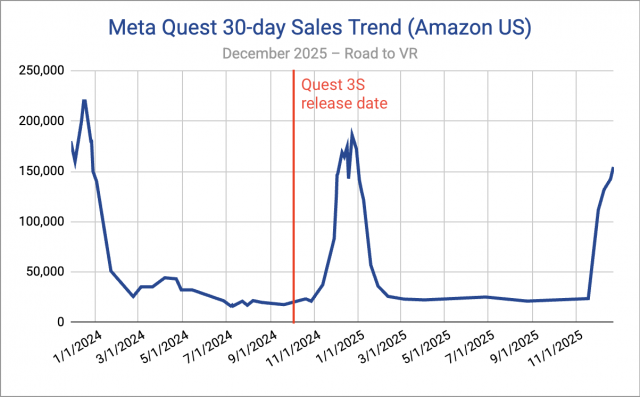 Nos últimos 30 dias (que inclui toda a semana de compras da Black Friday), os modelos Quest 3 e Quest 3S venderam coletivamente 154.000 unidades na Amazon US. Isso coloca os fones de ouvido um pouco à frente do mais novo console da Nintendo, o Switch 2, que vendeu 150 mil unidades na Amazon dos EUA nos últimos 30 dias e foi lançado em junho. Os outros grandes consoles (PlayStation 5/5 Pro e Xbox Series X/S), que agora são muito mais antigos, venderam menos que Quest ou Switch 2.