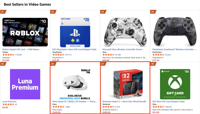 E na lista dos ‘Mais vendidos’ da Amazon na categoria Videogames, o fone de ouvido individual mais vendido da Meta, Quest 3S (128 GB), está logo à frente do pacote Switch 2 mais popular da Nintendo, nos números 6 e 7, respectivamente.